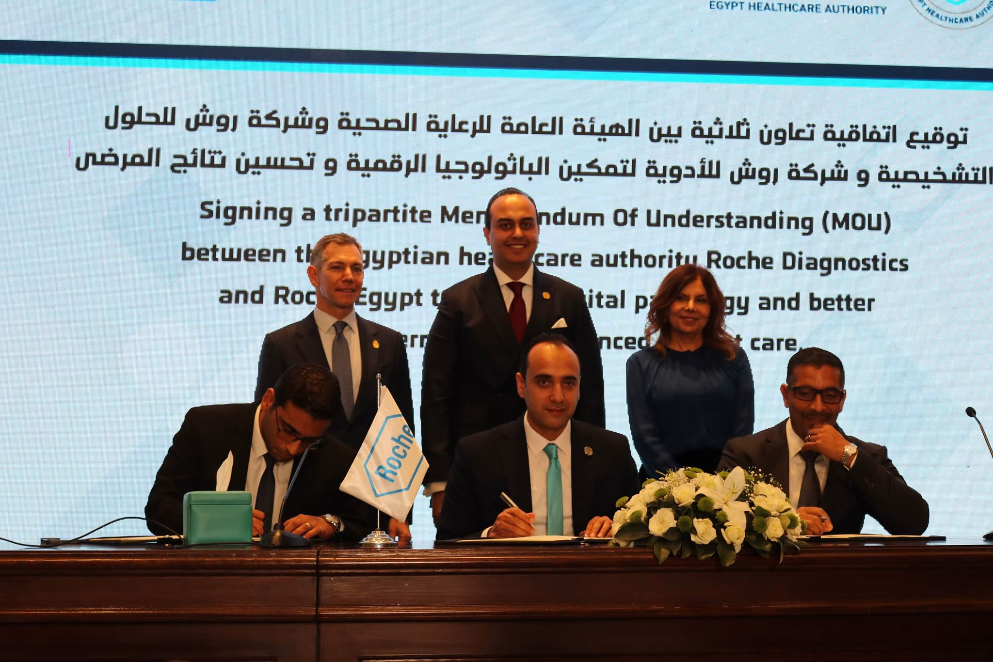 وقع الاتفاقية عن الهيئة العامة للرعاية الصحية، الدكتور أمير التلواني، المدير التنفيذي للهيئة، وعن شركة روش للحلول التشخيصية، المهندس معتز ناصف، المدير التنفيذي لشركة روش للحلول التشخيصية بمصر وشمال أفريقيا، نيابةً عن الدكتورة ليلى كنعان، المدير العام للشركة. كما وقع الاتفاقية عن شركة روش للأدوية، الدكتور زياد الأحول، رئيس قطاع الشؤون الحكومية والسياسات الصحية ودعم الأسواق.